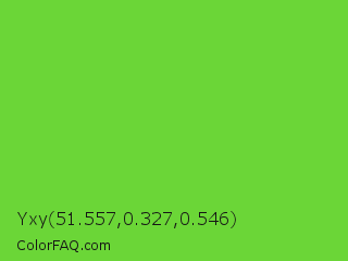 Yxy 51.557,0.327,0.546 Color is a normal green color and the nearest color is Green RYB #66b032. Hex code #6bd637 and RGB value is rgb(107,214,55). In RGB color space, this color is composed of 42% red, 84% green, 22% blue, In CMYK color space, this color is composed of 50% cyan, 0% magenta, 74% yellow , 16% black , In HSL color space, this color has a hue angle of 100° , 66% saturation and 53% lightness.