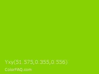 Yxy 51.575,0.355,0.556 Color is a normal green color and the nearest color is Sheen Green #8fd400. Hex code #85d301 and RGB value is rgb(133,211,1). In RGB color space, this color is composed of 52% red, 83% green, 0% blue, In CMYK color space, this color is composed of 37% cyan, 0% magenta, 100% yellow , 17% black , In HSL color space, this color has a hue angle of 82° , 99% saturation and 42% lightness.