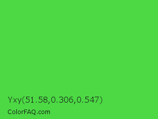 Yxy 51.58,0.306,0.547 Color is a normal green color and the nearest color is Lime Green #32cd32. Hex code #4cd944 and RGB value is rgb(76,217,68). In RGB color space, this color is composed of 30% red, 85% green, 27% blue, In CMYK color space, this color is composed of 65% cyan, 0% magenta, 69% yellow , 15% black , In HSL color space, this color has a hue angle of 117° , 66% saturation and 56% lightness.