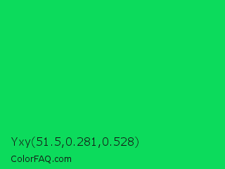 Yxy 51.5,0.281,0.528 Color is a normal green color and the nearest color is Malachite #0bda51. Hex code #0cdb5c and RGB value is rgb(12,219,92). In RGB color space, this color is composed of 5% red, 86% green, 36% blue, In CMYK color space, this color is composed of 95% cyan, 0% magenta, 58% yellow , 14% black , In HSL color space, this color has a hue angle of 143° , 90% saturation and 45% lightness.