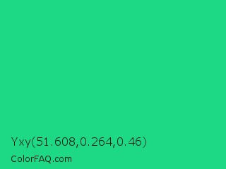 Yxy 51.608,0.264,0.46 Color is a normal green color and the nearest color is Shamrock #33cc99. Hex code #1dd986 and RGB value is rgb(29,217,134). In RGB color space, this color is composed of 11% red, 85% green, 53% blue, In CMYK color space, this color is composed of 87% cyan, 0% magenta, 38% yellow , 15% black , In HSL color space, this color has a hue angle of 154° , 76% saturation and 48% lightness.
