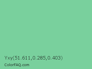Yxy 51.611,0.285,0.403 Color is a light green color and the nearest color is De York #7ac488. Hex code #79d09d and RGB value is rgb(121,208,157). In RGB color space, this color is composed of 47% red, 82% green, 62% blue, In CMYK color space, this color is composed of 42% cyan, 0% magenta, 25% yellow , 18% black , In HSL color space, this color has a hue angle of 145° , 48% saturation and 65% lightness.
