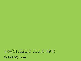 Yxy 51.622,0.353,0.494 Color is a normal green color and the nearest color is Conifer #acdd4d. Hex code #9ace52 and RGB value is rgb(154,206,82). In RGB color space, this color is composed of 60% red, 81% green, 32% blue, In CMYK color space, this color is composed of 25% cyan, 0% magenta, 60% yellow , 19% black , In HSL color space, this color has a hue angle of 85° , 56% saturation and 56% lightness.