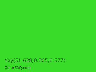 Yxy 51.628,0.305,0.577 Color is a normal green color and the nearest color is Lime Green #32cd32. Hex code #37db28 and RGB value is rgb(55,219,40). In RGB color space, this color is composed of 22% red, 86% green, 16% blue, In CMYK color space, this color is composed of 75% cyan, 0% magenta, 82% yellow , 14% black , In HSL color space, this color has a hue angle of 115° , 71% saturation and 51% lightness.