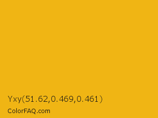 Yxy 51.62,0.469,0.461 Color is a normal orange color and the nearest color is Buttercup #f3ad16. Hex code #f0b514 and RGB value is rgb(240,181,20). In RGB color space, this color is composed of 94% red, 71% green, 8% blue, In CMYK color space, this color is composed of 0% cyan, 25% magenta, 92% yellow , 6% black , In HSL color space, this color has a hue angle of 44° , 88% saturation and 51% lightness.