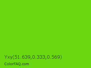 Yxy 51.639,0.333,0.569 Color is a normal green color and the nearest color is Lima #76bd17. Hex code #69d711 and RGB value is rgb(105,215,17). In RGB color space, this color is composed of 41% red, 84% green, 7% blue, In CMYK color space, this color is composed of 51% cyan, 0% magenta, 92% yellow , 16% black , In HSL color space, this color has a hue angle of 93° , 85% saturation and 45% lightness.