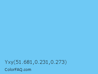 Yxy 51.681,0.231,0.273 Color is a light blue color and the nearest color is Maya Blue #73c2fb. Hex code #6ec9f5 and RGB value is rgb(110,201,245). In RGB color space, this color is composed of 43% red, 79% green, 96% blue, In CMYK color space, this color is composed of 55% cyan, 18% magenta, 0% yellow , 4% black , In HSL color space, this color has a hue angle of 200° , 87% saturation and 70% lightness.