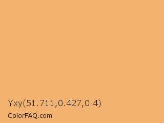 Yxy 51.711,0.427,0.4 Color is a light orange color and the nearest color is Middle Yellow Red #ecb176. Hex code #f1b270 and RGB value is rgb(241,178,112). In RGB color space, this color is composed of 95% red, 70% green, 44% blue, In CMYK color space, this color is composed of 0% cyan, 26% magenta, 54% yellow , 5% black , In HSL color space, this color has a hue angle of 31° , 82% saturation and 69% lightness.