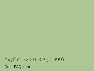 Yxy 51.724,0.329,0.399 Color is a light green color and the nearest color is Norway #a8bd9f. Hex code #acc793 and RGB value is rgb(172,199,147). In RGB color space, this color is composed of 67% red, 78% green, 58% blue, In CMYK color space, this color is composed of 14% cyan, 0% magenta, 26% yellow , 22% black , In HSL color space, this color has a hue angle of 91° , 32% saturation and 68% lightness.