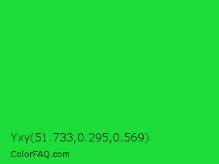 Yxy 51.733,0.295,0.569 Color is a normal green color and the nearest color is Lime Green #32cd32. Hex code #1ddc38 and RGB value is rgb(29,220,56). In RGB color space, this color is composed of 11% red, 86% green, 22% blue, In CMYK color space, this color is composed of 87% cyan, 0% magenta, 75% yellow , 14% black , In HSL color space, this color has a hue angle of 128° , 77% saturation and 49% lightness.