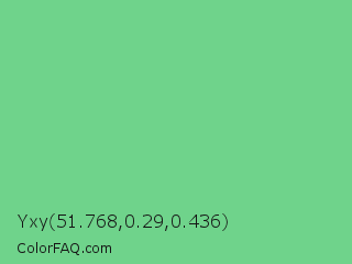 Yxy 51.768,0.29,0.436 Color is a light green color and the nearest color is De York #7ac488. Hex code #6fd38b and RGB value is rgb(111,211,139). In RGB color space, this color is composed of 44% red, 83% green, 55% blue, In CMYK color space, this color is composed of 47% cyan, 0% magenta, 34% yellow , 17% black , In HSL color space, this color has a hue angle of 137° , 53% saturation and 63% lightness.