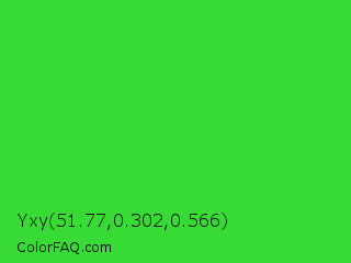 Yxy 51.77,0.302,0.566 Color is a normal green color and the nearest color is Lime Green #32cd32. Hex code #38db36 and RGB value is rgb(56,219,54). In RGB color space, this color is composed of 22% red, 86% green, 21% blue, In CMYK color space, this color is composed of 74% cyan, 0% magenta, 75% yellow , 14% black , In HSL color space, this color has a hue angle of 119° , 70% saturation and 54% lightness.