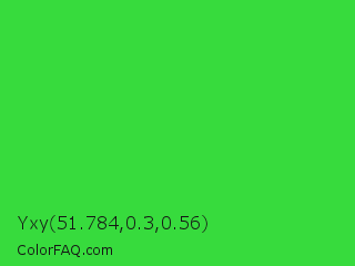 Yxy 51.784,0.3,0.56 Color is a normal green color and the nearest color is Lime Green #32cd32. Hex code #37db3d and RGB value is rgb(55,219,61). In RGB color space, this color is composed of 22% red, 86% green, 24% blue, In CMYK color space, this color is composed of 75% cyan, 0% magenta, 72% yellow , 14% black , In HSL color space, this color has a hue angle of 122° , 69% saturation and 54% lightness.