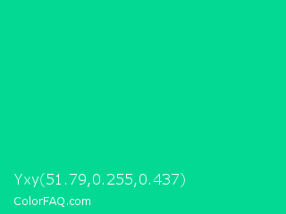 Yxy 51.79,0.255,0.437 Color is a normal green color and the nearest color is Caribbean Green #00cc99. Hex code #04d994 and RGB value is rgb(4,217,148). In RGB color space, this color is composed of 2% red, 85% green, 58% blue, In CMYK color space, this color is composed of 98% cyan, 0% magenta, 32% yellow , 15% black , In HSL color space, this color has a hue angle of 161° , 96% saturation and 43% lightness.