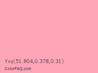 Yxy 51.804,0.378,0.31 Color is a very light red color and the nearest color is Sundown #ffb1b3. Hex code #fea6b8 and RGB value is rgb(254,166,184). In RGB color space, this color is composed of 100% red, 65% green, 72% blue, In CMYK color space, this color is composed of 0% cyan, 35% magenta, 28% yellow , 0% black , In HSL color space, this color has a hue angle of 348° , 98% saturation and 82% lightness.