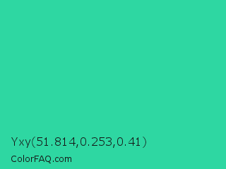 Yxy 51.814,0.253,0.41 Color is a normal green color and the nearest color is Shamrock #33cc99. Hex code #2ed7a2 and RGB value is rgb(46,215,162). In RGB color space, this color is composed of 18% red, 84% green, 64% blue, In CMYK color space, this color is composed of 79% cyan, 0% magenta, 25% yellow , 16% black , In HSL color space, this color has a hue angle of 161° , 68% saturation and 51% lightness.