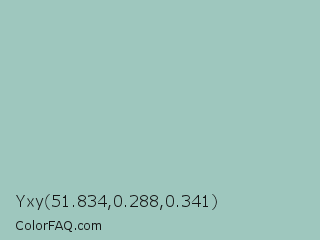 Yxy 51.834,0.288,0.341 Color is a light cyan color and the nearest color is Shadow Green #9ac2b8. Hex code #9ec7be and RGB value is rgb(158,199,190). In RGB color space, this color is composed of 62% red, 78% green, 75% blue, In CMYK color space, this color is composed of 21% cyan, 0% magenta, 5% yellow , 22% black , In HSL color space, this color has a hue angle of 167° , 27% saturation and 70% lightness.