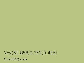 Yxy 51.858,0.353,0.416 Color is a light lime color and the nearest color is Sage #bcb88a. Hex code #b9c582 and RGB value is rgb(185,197,130). In RGB color space, this color is composed of 73% red, 77% green, 51% blue, In CMYK color space, this color is composed of 6% cyan, 0% magenta, 34% yellow , 23% black , In HSL color space, this color has a hue angle of 71° , 37% saturation and 64% lightness.
