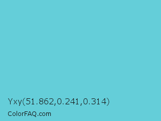 Yxy 51.862,0.241,0.314 Color is a light cyan color and the nearest color is Viking #64ccdb. Hex code #64ced9 and RGB value is rgb(100,206,217). In RGB color space, this color is composed of 39% red, 81% green, 85% blue, In CMYK color space, this color is composed of 54% cyan, 5% magenta, 0% yellow , 15% black , In HSL color space, this color has a hue angle of 186° , 61% saturation and 62% lightness.