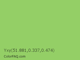 Yxy 51.881,0.337,0.474 Color is a light green color and the nearest color is Pistachio #93c572. Hex code #94cf66 and RGB value is rgb(148,207,102). In RGB color space, this color is composed of 58% red, 81% green, 40% blue, In CMYK color space, this color is composed of 29% cyan, 0% magenta, 51% yellow , 19% black , In HSL color space, this color has a hue angle of 94° , 52% saturation and 61% lightness.