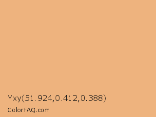 Yxy 51.924,0.412,0.388 Color is a light orange color and the nearest color is Tacao #edb381. Hex code #eeb37e and RGB value is rgb(238,179,126). In RGB color space, this color is composed of 93% red, 70% green, 49% blue, In CMYK color space, this color is composed of 0% cyan, 25% magenta, 47% yellow , 7% black , In HSL color space, this color has a hue angle of 28° , 77% saturation and 71% lightness.