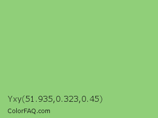 Yxy 51.935,0.323,0.45 Color is a light green color and the nearest color is Pistachio #93c572. Hex code #90cf79 and RGB value is rgb(144,207,121). In RGB color space, this color is composed of 56% red, 81% green, 47% blue, In CMYK color space, this color is composed of 30% cyan, 0% magenta, 42% yellow , 19% black , In HSL color space, this color has a hue angle of 104° , 47% saturation and 64% lightness.