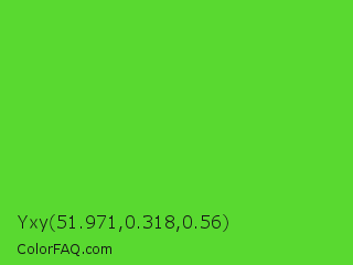 Yxy 51.971,0.318,0.56 Color is a normal green color and the nearest color is Harlequin Green #46cb18. Hex code #59d930 and RGB value is rgb(89,217,48). In RGB color space, this color is composed of 35% red, 85% green, 19% blue, In CMYK color space, this color is composed of 59% cyan, 0% magenta, 78% yellow , 15% black , In HSL color space, this color has a hue angle of 105° , 69% saturation and 52% lightness.