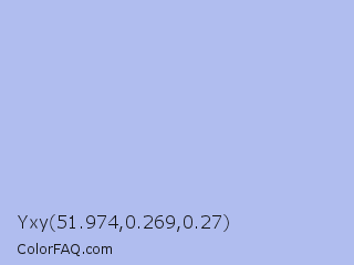 Yxy 51.974,0.269,0.27 Color is a very light blue color and the nearest color is Perano #a9bef2. Hex code #b0bdef and RGB value is rgb(176,189,239). In RGB color space, this color is composed of 69% red, 74% green, 94% blue, In CMYK color space, this color is composed of 26% cyan, 21% magenta, 0% yellow , 6% black , In HSL color space, this color has a hue angle of 228° , 66% saturation and 81% lightness.