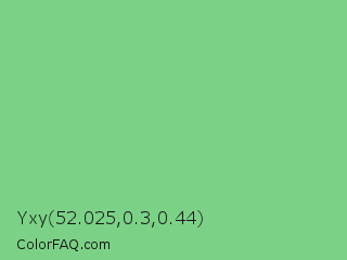 Yxy 52.025,0.3,0.44 Color is a light green color and the nearest color is De York #7ac488. Hex code #7bd286 and RGB value is rgb(123,210,134). In RGB color space, this color is composed of 48% red, 82% green, 53% blue, In CMYK color space, this color is composed of 41% cyan, 0% magenta, 36% yellow , 18% black , In HSL color space, this color has a hue angle of 128° , 49% saturation and 65% lightness.