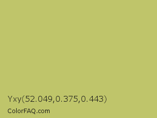 Yxy 52.049,0.375,0.443 Color is a normal yellow color and the nearest color is Wild Willow #b9c46a. Hex code #bfc56a and RGB value is rgb(191,197,106). In RGB color space, this color is composed of 75% red, 77% green, 42% blue, In CMYK color space, this color is composed of 3% cyan, 0% magenta, 46% yellow , 23% black , In HSL color space, this color has a hue angle of 64° , 44% saturation and 59% lightness.