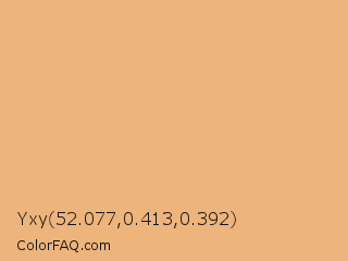 Yxy 52.077,0.413,0.392 Color is a light orange color and the nearest color is Middle Yellow Red #ecb176. Hex code #edb47b and RGB value is rgb(237,180,123). In RGB color space, this color is composed of 93% red, 71% green, 48% blue, In CMYK color space, this color is composed of 0% cyan, 24% magenta, 48% yellow , 7% black , In HSL color space, this color has a hue angle of 30° , 76% saturation and 71% lightness.