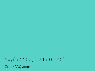 Yxy 52.102,0.246,0.346 Color is a normal cyan color and the nearest color is Medium Turquoise #48d1cc. Hex code #56d2c6 and RGB value is rgb(86,210,198). In RGB color space, this color is composed of 34% red, 82% green, 78% blue, In CMYK color space, this color is composed of 59% cyan, 0% magenta, 6% yellow , 18% black , In HSL color space, this color has a hue angle of 174° , 58% saturation and 58% lightness.