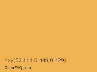 Yxy 52.114,0.448,0.429 Color is a light orange color and the nearest color is Casablanca #f8b853. Hex code #f2b451 and RGB value is rgb(242,180,81). In RGB color space, this color is composed of 95% red, 71% green, 32% blue, In CMYK color space, this color is composed of 0% cyan, 26% magenta, 67% yellow , 5% black , In HSL color space, this color has a hue angle of 37° , 86% saturation and 63% lightness.