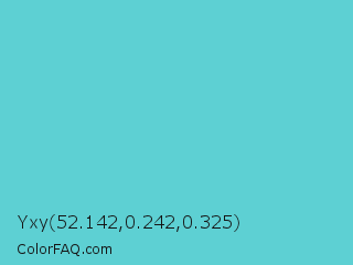 Yxy 52.142,0.242,0.325 Color is a normal cyan color and the nearest color is Viking #64ccdb. Hex code #5dd0d3 and RGB value is rgb(93,208,211). In RGB color space, this color is composed of 36% red, 82% green, 83% blue, In CMYK color space, this color is composed of 56% cyan, 1% magenta, 0% yellow , 17% black , In HSL color space, this color has a hue angle of 182° , 57% saturation and 60% lightness.