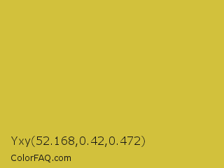 Yxy 52.168,0.42,0.472 Color is a normal yellow color and the nearest color is Earls Green #c9b93b. Hex code #d2c13c and RGB value is rgb(210,193,60). In RGB color space, this color is composed of 82% red, 76% green, 24% blue, In CMYK color space, this color is composed of 0% cyan, 8% magenta, 71% yellow , 18% black , In HSL color space, this color has a hue angle of 53° , 63% saturation and 53% lightness.