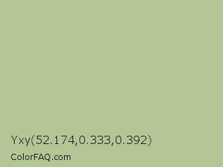 Yxy 52.174,0.333,0.392 Color is a light green color and the nearest color is Norway #a8bd9f. Hex code #b3c696 and RGB value is rgb(179,198,150). In RGB color space, this color is composed of 70% red, 78% green, 59% blue, In CMYK color space, this color is composed of 10% cyan, 0% magenta, 24% yellow , 22% black , In HSL color space, this color has a hue angle of 84° , 30% saturation and 68% lightness.