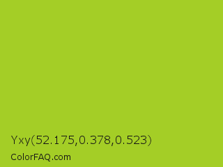 Yxy 52.175,0.378,0.523 Color is a normal lime color and the nearest color is Atlantis #97cd2d. Hex code #a4ce26 and RGB value is rgb(164,206,38). In RGB color space, this color is composed of 64% red, 81% green, 15% blue, In CMYK color space, this color is composed of 20% cyan, 0% magenta, 82% yellow , 19% black , In HSL color space, this color has a hue angle of 75° , 69% saturation and 48% lightness.