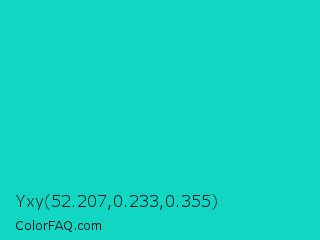 Yxy 52.207,0.233,0.355 Color is a normal cyan color and the nearest color is Robins Egg Blue #00cccc. Hex code #11d6c4 and RGB value is rgb(17,214,196). In RGB color space, this color is composed of 7% red, 84% green, 77% blue, In CMYK color space, this color is composed of 92% cyan, 0% magenta, 8% yellow , 16% black , In HSL color space, this color has a hue angle of 175° , 85% saturation and 45% lightness.