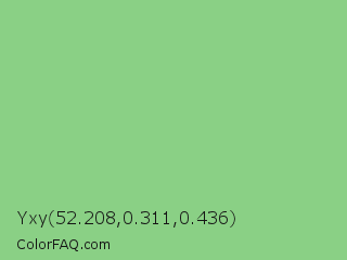 Yxy 52.208,0.311,0.436 Color is a light green color and the nearest color is De York #7ac488. Hex code #8ad085 and RGB value is rgb(138,208,133). In RGB color space, this color is composed of 54% red, 82% green, 52% blue, In CMYK color space, this color is composed of 34% cyan, 0% magenta, 36% yellow , 18% black , In HSL color space, this color has a hue angle of 116° , 44% saturation and 67% lightness.