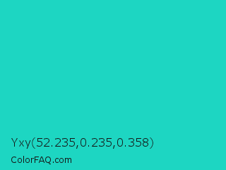 Yxy 52.235,0.235,0.358 Color is a normal cyan color and the nearest color is Turquoise PWG #30d5c8. Hex code #1dd6c2 and RGB value is rgb(29,214,194). In RGB color space, this color is composed of 11% red, 84% green, 76% blue, In CMYK color space, this color is composed of 86% cyan, 0% magenta, 9% yellow , 16% black , In HSL color space, this color has a hue angle of 174° , 76% saturation and 48% lightness.