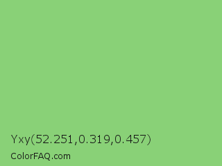 Yxy 52.251,0.319,0.457 Color is a light green color and the nearest color is Pistachio #93c572. Hex code #89d177 and RGB value is rgb(137,209,119). In RGB color space, this color is composed of 54% red, 82% green, 47% blue, In CMYK color space, this color is composed of 34% cyan, 0% magenta, 43% yellow , 18% black , In HSL color space, this color has a hue angle of 108° , 49% saturation and 64% lightness.