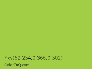 Yxy 52.254,0.366,0.502 Color is a normal lime color and the nearest color is Android Green #a4c639. Hex code #a2ce45 and RGB value is rgb(162,206,69). In RGB color space, this color is composed of 64% red, 81% green, 27% blue, In CMYK color space, this color is composed of 21% cyan, 0% magenta, 67% yellow , 19% black , In HSL color space, this color has a hue angle of 79° , 58% saturation and 54% lightness.