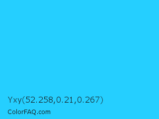 Yxy 52.258,0.21,0.267 Color is a normal cyan color and the nearest color is Spiro Disco Ball #0fc0fc. Hex code #25cfff and RGB value is rgb(37,207,255). In RGB color space, this color is composed of 15% red, 81% green, 100% blue, In CMYK color space, this color is composed of 85% cyan, 19% magenta, 0% yellow , 0% black , In HSL color space, this color has a hue angle of 193° , 100% saturation and 57% lightness.
