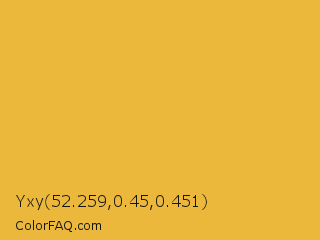 Yxy 52.259,0.45,0.451 Color is a normal orange color and the nearest color is Tulip Tree #eab33b. Hex code #ebb83b and RGB value is rgb(235,184,59). In RGB color space, this color is composed of 92% red, 72% green, 23% blue, In CMYK color space, this color is composed of 0% cyan, 22% magenta, 75% yellow , 8% black , In HSL color space, this color has a hue angle of 43° , 81% saturation and 58% lightness.