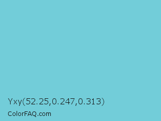 Yxy 52.25,0.247,0.313 Color is a light cyan color and the nearest color is Viking #64ccdb. Hex code #72cdd9 and RGB value is rgb(114,205,217). In RGB color space, this color is composed of 45% red, 80% green, 85% blue, In CMYK color space, this color is composed of 47% cyan, 6% magenta, 0% yellow , 15% black , In HSL color space, this color has a hue angle of 187° , 58% saturation and 65% lightness.