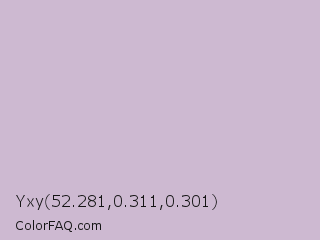 Yxy 52.281,0.311,0.301 Color is a light purple color and the nearest color is Pink Lavender #d8b2d1. Hex code #cdb9d1 and RGB value is rgb(205,185,209). In RGB color space, this color is composed of 80% red, 73% green, 82% blue, In CMYK color space, this color is composed of 2% cyan, 11% magenta, 0% yellow , 18% black , In HSL color space, this color has a hue angle of 290° , 21% saturation and 77% lightness.