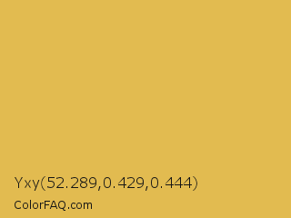 Yxy 52.289,0.429,0.444 Color is a normal orange color and the nearest color is Anzac #e0b646. Hex code #e2bb50 and RGB value is rgb(226,187,80). In RGB color space, this color is composed of 89% red, 73% green, 31% blue, In CMYK color space, this color is composed of 0% cyan, 17% magenta, 65% yellow , 11% black , In HSL color space, this color has a hue angle of 44° , 72% saturation and 60% lightness.