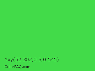 Yxy 52.302,0.3,0.545 Color is a normal green color and the nearest color is Lime Green #32cd32. Hex code #42db49 and RGB value is rgb(66,219,73). In RGB color space, this color is composed of 26% red, 86% green, 29% blue, In CMYK color space, this color is composed of 70% cyan, 0% magenta, 67% yellow , 14% black , In HSL color space, this color has a hue angle of 123° , 68% saturation and 56% lightness.