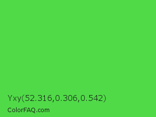 Yxy 52.316,0.306,0.542 Color is a normal green color and the nearest color is Lime Green #32cd32. Hex code #50da48 and RGB value is rgb(80,218,72). In RGB color space, this color is composed of 31% red, 85% green, 28% blue, In CMYK color space, this color is composed of 63% cyan, 0% magenta, 67% yellow , 15% black , In HSL color space, this color has a hue angle of 117° , 66% saturation and 57% lightness.