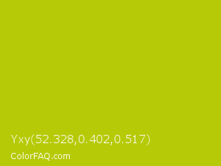 Yxy 52.328,0.402,0.517 Color is a normal yellow color and the nearest color is Rio Grande #bbd009. Hex code #b7ca08 and RGB value is rgb(183,202,8). In RGB color space, this color is composed of 72% red, 79% green, 3% blue, In CMYK color space, this color is composed of 9% cyan, 0% magenta, 96% yellow , 21% black , In HSL color space, this color has a hue angle of 66° , 92% saturation and 41% lightness.